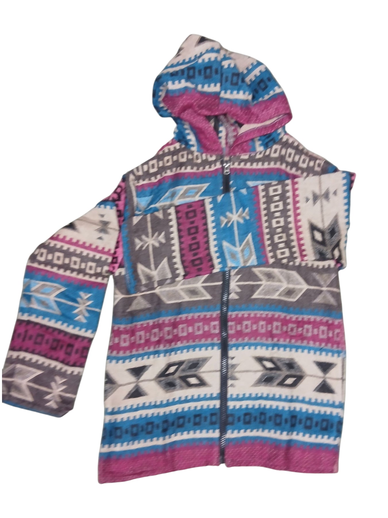 Bohotusk Aztec Pattern Lightweight Fleece Hooded Jacket - full front zip with 2 side pockets. Unlined so a midweight autumn jacket / hooded zip up top.