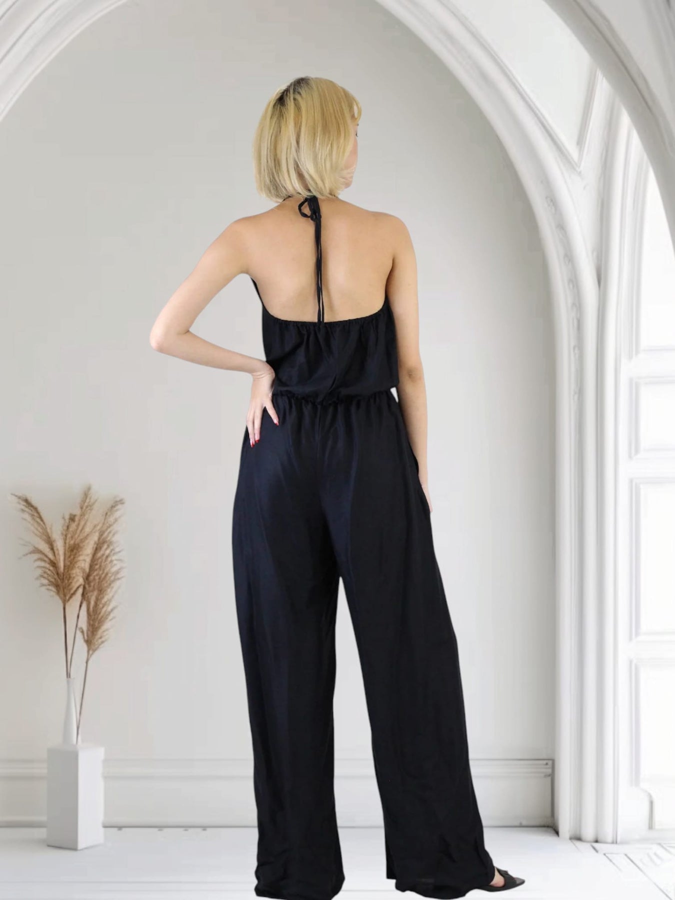 A classic, elegant plain black Jumpsuit - a perfect blend of comfort and style for your summer wardrobe. Crafted from 100% rayon viscose, this soft and attractive jumpsuit features adjustable shoulder straps, a flattering V-neckline, a defined waistband with a belt, and wide-leg pants for a chic silhouette. Ideal for casual outings, beach trips, vacations, dates, parties, or clubs, this versatile piece is designed to make you stand out effortlessly. The design fits bust sizes from 26" to 38" (66–96 cm), with a length of 59" (150 cm) and hips up to 43" (109 cm). Inside leg is 30" (76cm) and for reference the model is 5ft 7"...